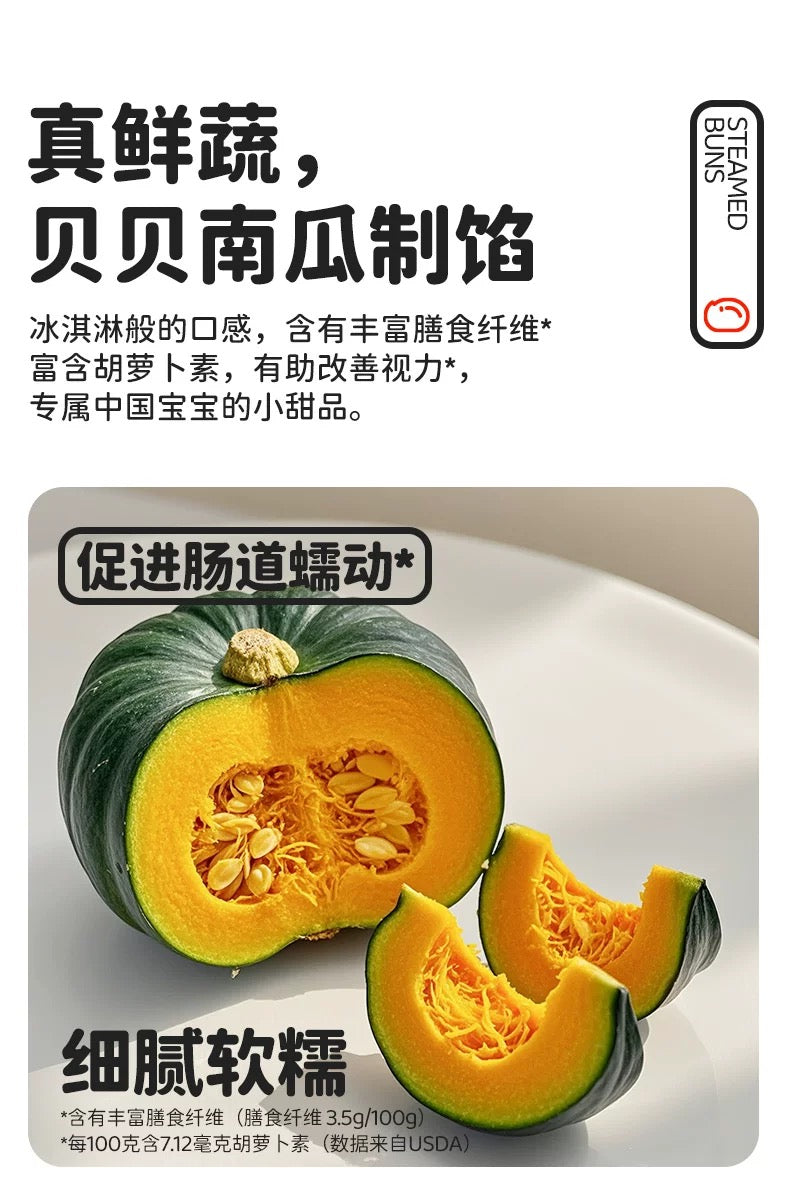 贝贝南瓜原料:选用新鲜贝贝南瓜打泥入面,天然橙黄,香甜软糯。