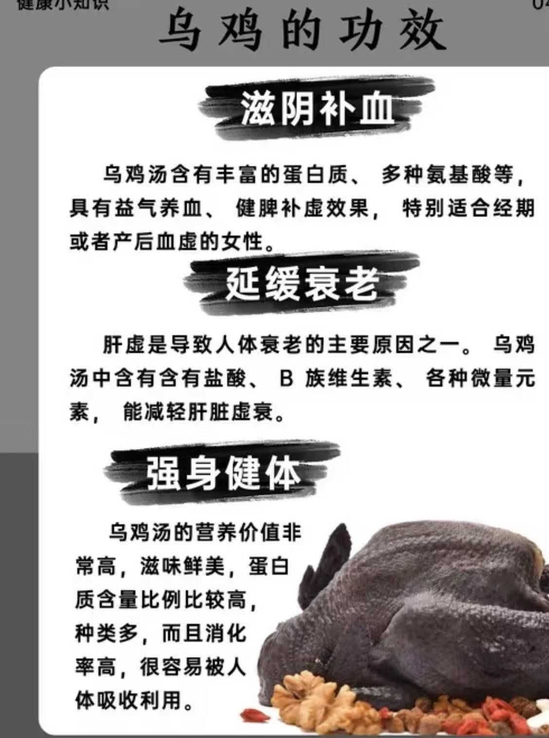 乌鸡又被叫做月子鸡🐔😎 肉质鲜美,味道醇厚😍补而不燥‼️ 性平、味甘,为补虚劳、养身体的上好佳品,具有滋阴养血清热、补肝益肾、健脾止泻等作用☺️乌鸡的蛋白质含量比普通鸡略高,而脂肪含量仅为普通鸡的1/4,是名副其实的高蛋白低脂肪食物。🥳🥳此外,乌鸡中的维生素B2、尼克酸、维生素E、钙、镁、铁、锌等营养成分含量均远高于普通鸡😬🉑️爆炒🉑️炖🉑️汤