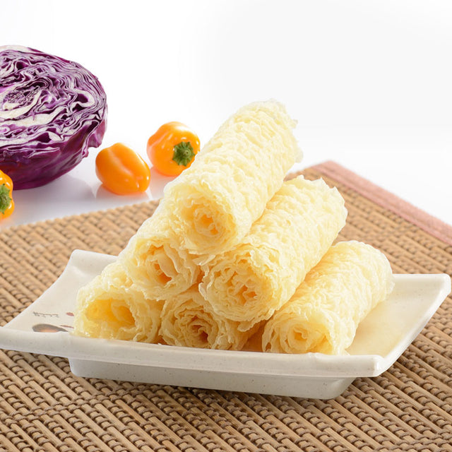 由精选的豆皮快速油炸后精制成卷,一层一层包裹后让吃起来的口感更丰富,适合搭配任何汤食享用。 浸入汤里3秒后仍能保持酥脆的口感及浓郁的豆香味。