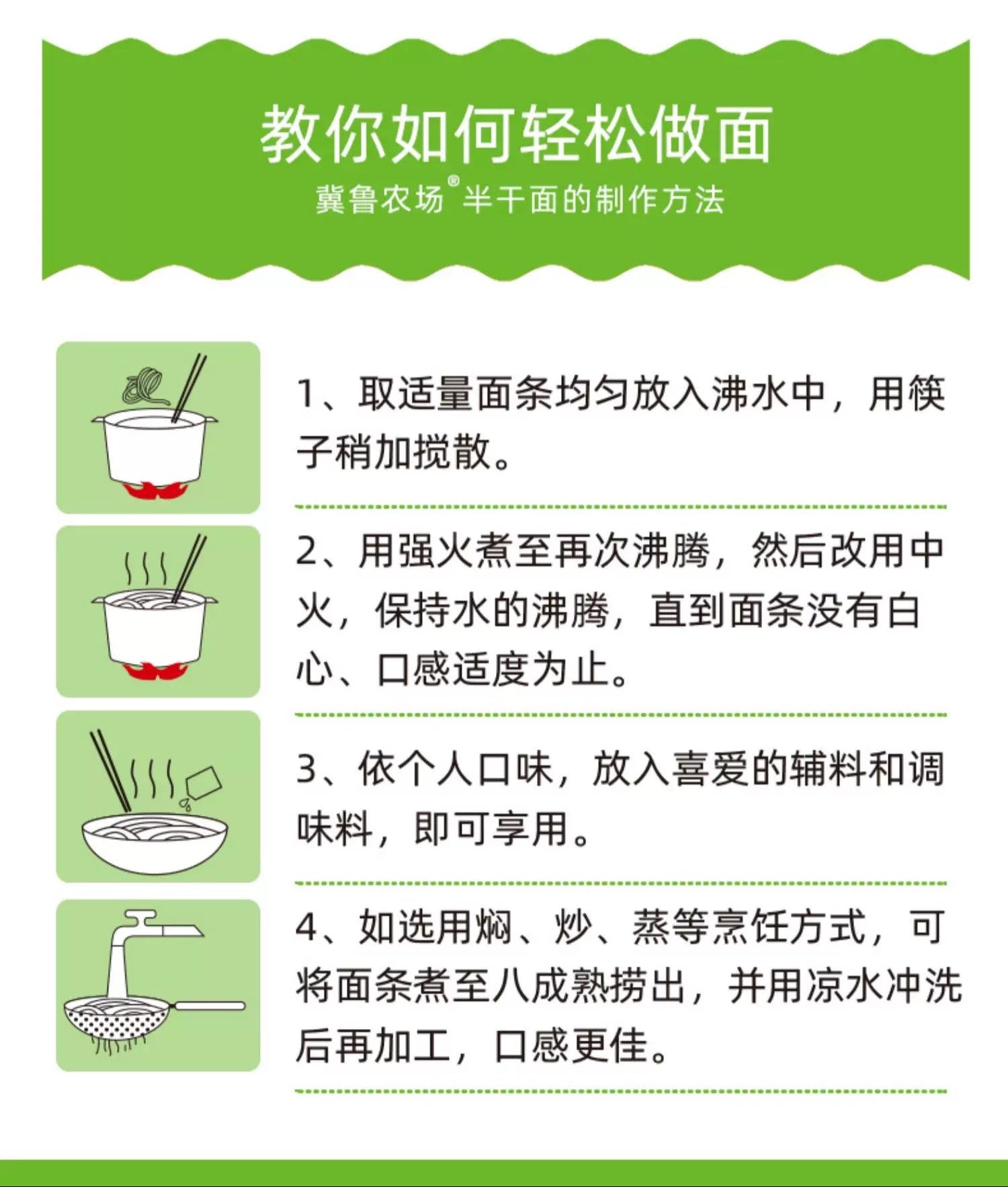 劲道爽滑:面条筋道不粘,口感清香,久煮不易糊汤。