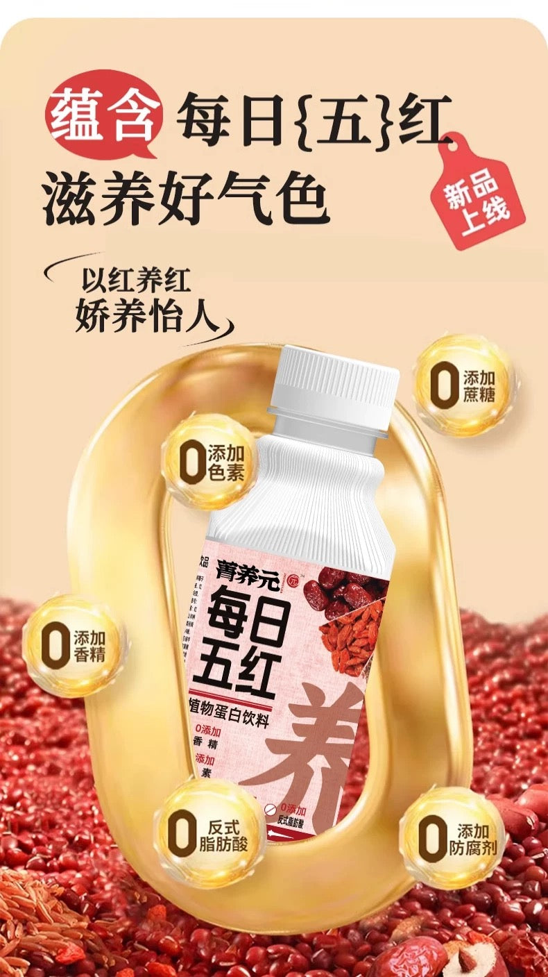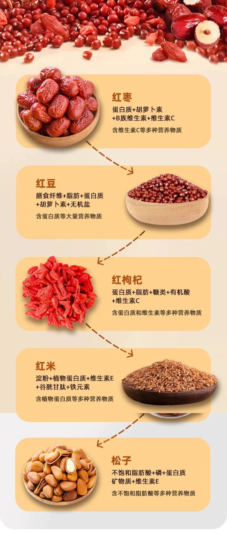 甄选五种红色营养食材:红豆、红枣、枸杞、红米、松子,融合现代植物蛋白科技,富含天然植物营养与蛋白质,香甜顺滑,滋补又养颜,是每日活力首选。