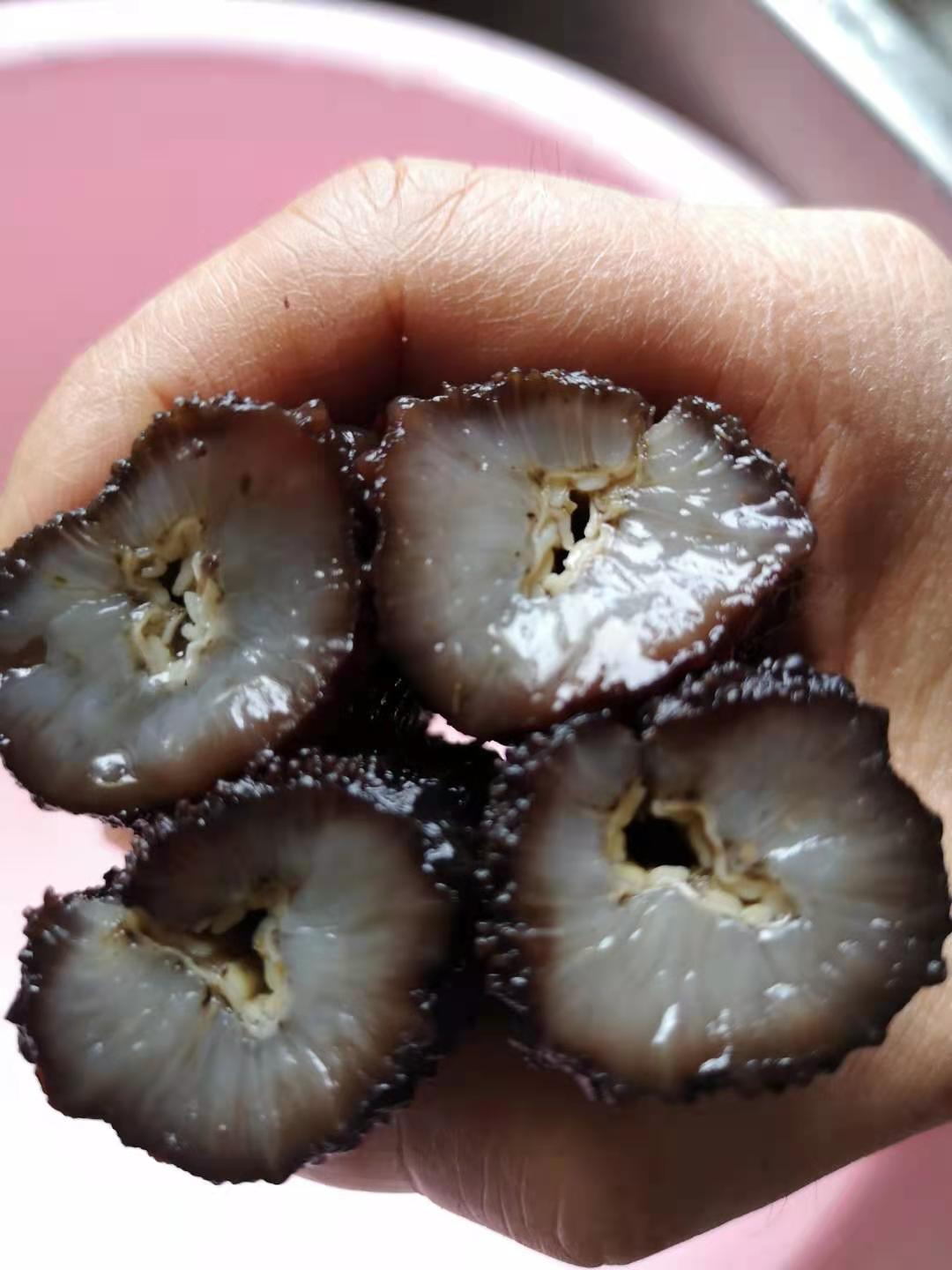 3. 用剪刀剪开肚子,去掉海参两头的沙嘴,里面白色的是营养丰富筯,可以吃的的,把海参筋拿出来,海参和筋单独清洗,容易洗掉肚子里的沙,这种海参在海边就吐完了肠子的。